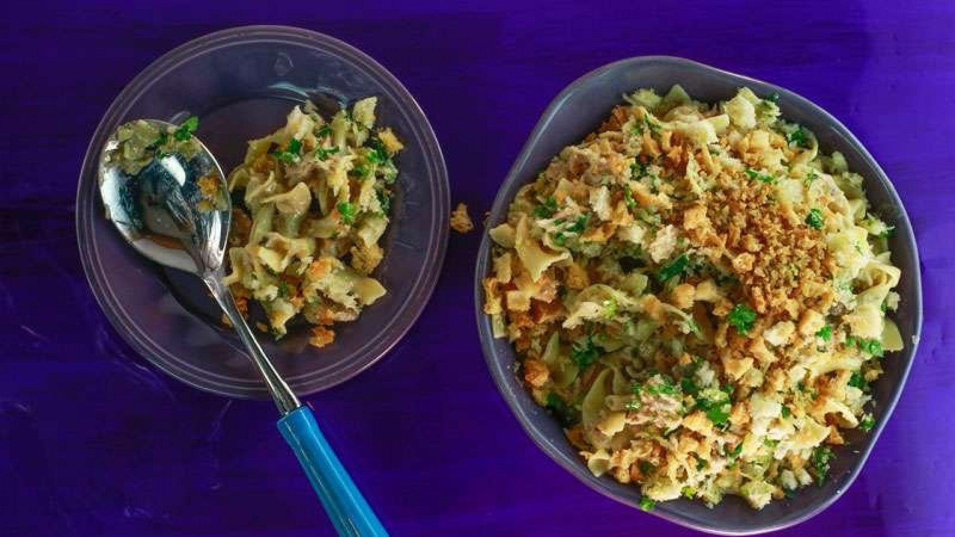Add lemon juice and flaked tuna to veggies then add drained noodles and toss to coat. Transfer mixture to a casserole dish. Toss breadcrumbs with a drizzle of olive oil, cheeses and parsley. Top the casserole with breadcrumbs.