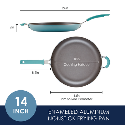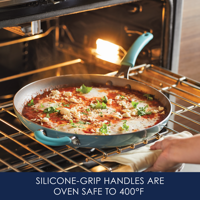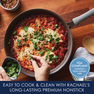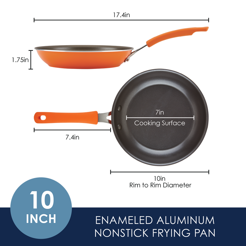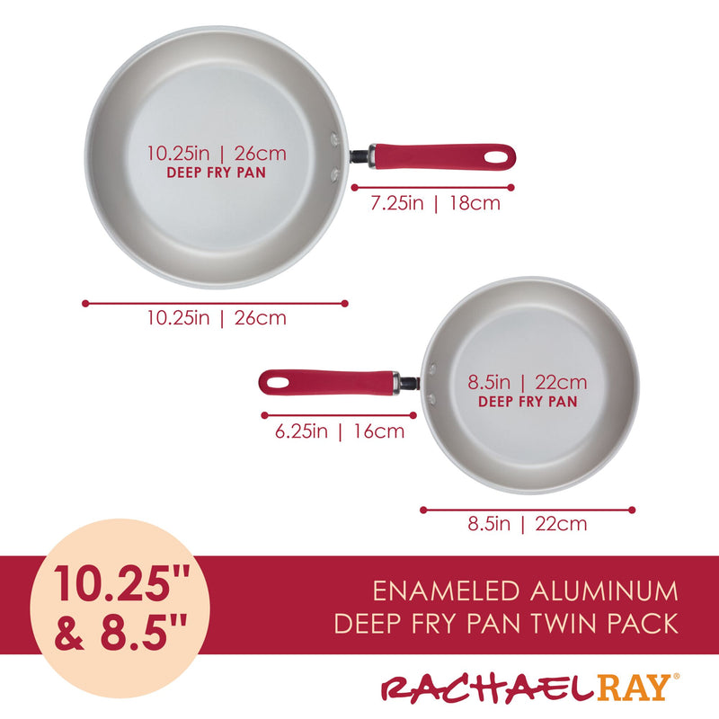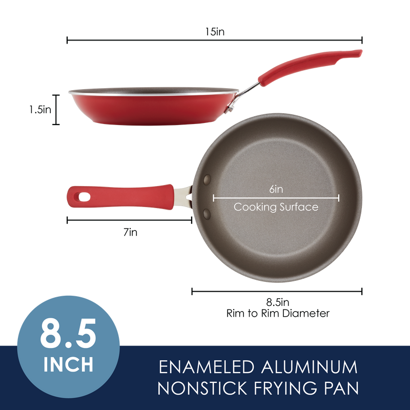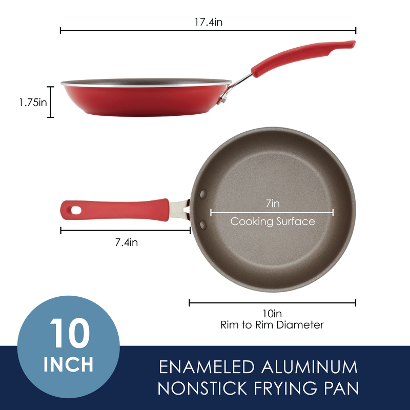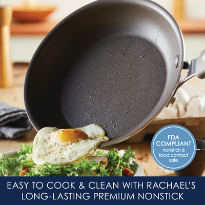 High-performance and easy convenience is twice as nice with two essential kitchen skillets featuring a deeper and more versatile pan design. Made with higher sides for an enhanced cooking surface, these smart frying pans from Rachael Ray feature PlatinumShield nonstick reinforced to be 9x harder than titanium for effortless food release of the stickiest recipes. Even better, the frying pans are dishwasher safe for quick and easy cleanup. Colorful, double-riveted handles provide comfort and control that's oven safe to 400°F, flared rims make for easy pouring, and induction-suitable stainless steel bases provide strength, durability, and versatility to use the skillets on any stovetop.