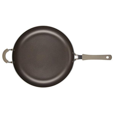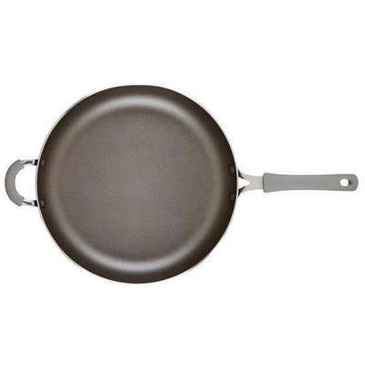 This fun and super-functional sautéing pan is crafted from thicker gauge aluminum for a luxe, sturdy feel, and reliable stovetop performance that heats up quickly and evenly. The sleek, on-trend contemporary design features a wider cooking surface to cook larger portions of pasta, veggies, stir frys and more with optimum performance and flair. Want even more convenience? This pan is ideal for easy table side presentation and features nonstick coated rivets for super smooth stirring and an easy-clean cooking surface that doesn't allow for food build-up around the handle attachments. The new triple layer nonstick provides the ultimate performance in scratch resistance and durability, and to top it all off, this sauté master is oven safe to 400°F to take on a wide range of recipes.