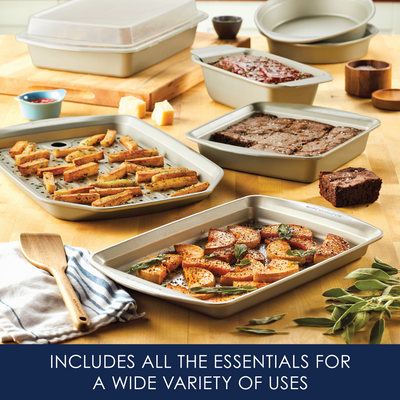 SET INCLUDES: Two 10-inch x 15-inch sheet pans, Two 9-inch round cake pans, 9-inch square cake pan, loaf pan with insert, 9-inch x 13-inch rectangular cake pan with lid, 12-cup muffin/cupcake pan