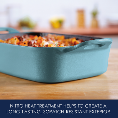 Meet your new kitchen hero! Get incredible cast iron performance that's easy to maintain with this Rachael Ray NITRO Cast Iron Roasting Pan that delivers the classic durability and performance of cast iron without the hassle of complicated cleaning, making this 9-inch x 13-inch meal maker ideal for use as a lasagna pan, casserole pan, or roaster. A next-generation nitro heat treatment seals and smooths surfaces for amazing, easy-to-use, easy-to-clean cast iron that's fortified to resist rust, chipping, and staining but still holds brilliant colors to complement any kitchen style. Oven safe to a ripping 500°F, induction capable and made to last a lifetime (and look great for a lifetime, too), this durable cast iron roasting pan is pre-seasoned and ready to deliver. See why cast iron is one of Rachael's favorite ways to make meals even more delish.