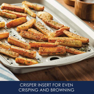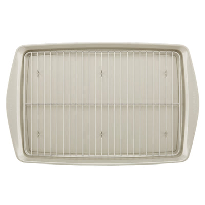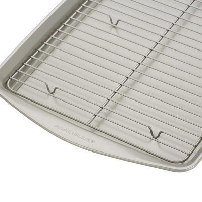 Go family-size with the hot wings and french fries with this jumbo nonstick cookie sheet and rack. Made from heavy gauge steel, this large cookie pan resists warping and features long-lasting nonstick to provide excellent food release. Oven safe to 450°F.