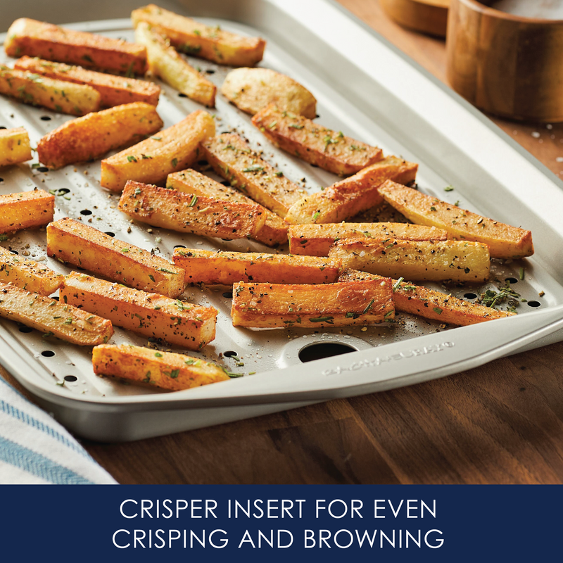 Get three incredibly versatile pans for baking, crisping and roasting. Made from heavy gauge steel, these nonstick cookie pans resist warping and feature long-lasting nonstick that provides excellent food release. Oven safe to 450°F.