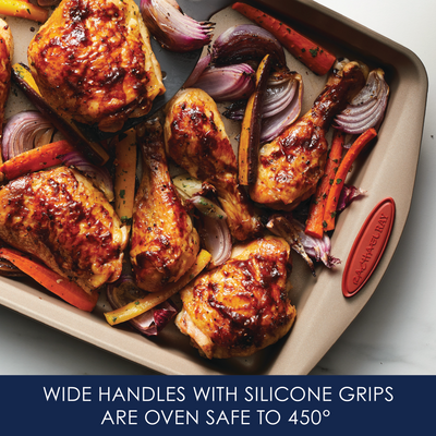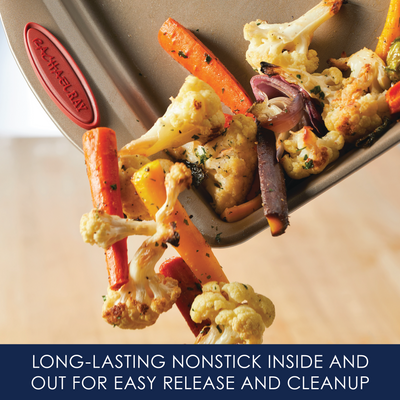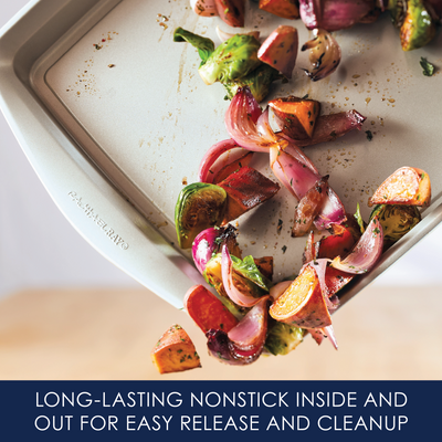 Bake batches of cookies, make delicious cakes, and roast sheet-pan dinners with this durable, heavy gauge steel bakeware set. Long-lasting nonstick inside and out provides outstanding food release with quick cleanup. Oven safe to 450°F.